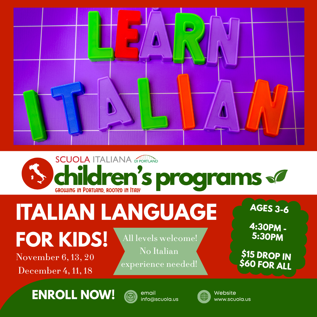 Join us this fall and winter for and fun and playful Italian language class inspired by our Saturday Class but designed for busy families who can’t attend on weekends. Introduction to Italian through songs, games, and movement. All levels are welcome, from beginner to fluent speaker. This is a drop off class. If you register for all six classes you get a discounted rate!