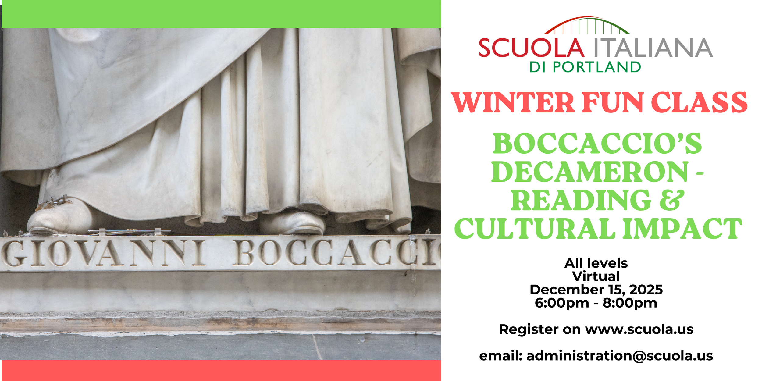 Calling all bibliophiles and those who want to learn about an important cultural milestone in literary history! Please join us on December 15, 2025 from 6:00pm - 8:00pm via Zoom to discuss the Italian masterpiece Boccaccio’s Decameron - in translation. This class will be an intro to the masterpiece and read the prologue and a couple of stories in advance to discuss. This class is appropriate for all levels.